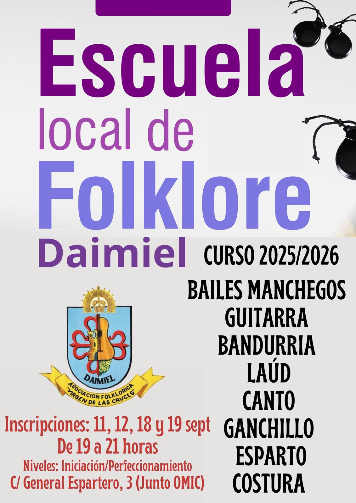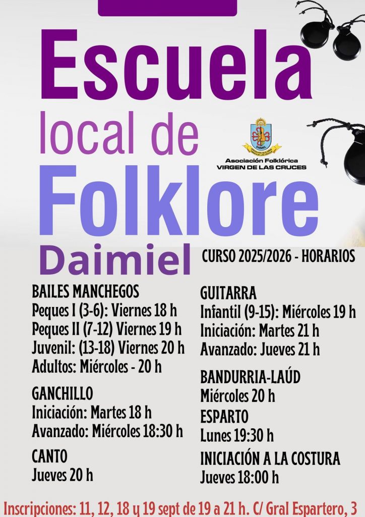 Las clases de la Escuela Local de Folklore comienzan el día 1 de octubre de 2025 y son impartidas por componentes de la Asociación Folklórica Virgen de las Cruces. Habrá niveles de iniciación y perfeccionamiento y las inscripciones se formalizarán los días 11, 12, 18 y 19 de septiembre, en horario de 19 a 21 horas en la calle General Espartero, 3 (Junto a la OMIC) y el coste de todo el curso será de 30 €. (25 € para los socios)