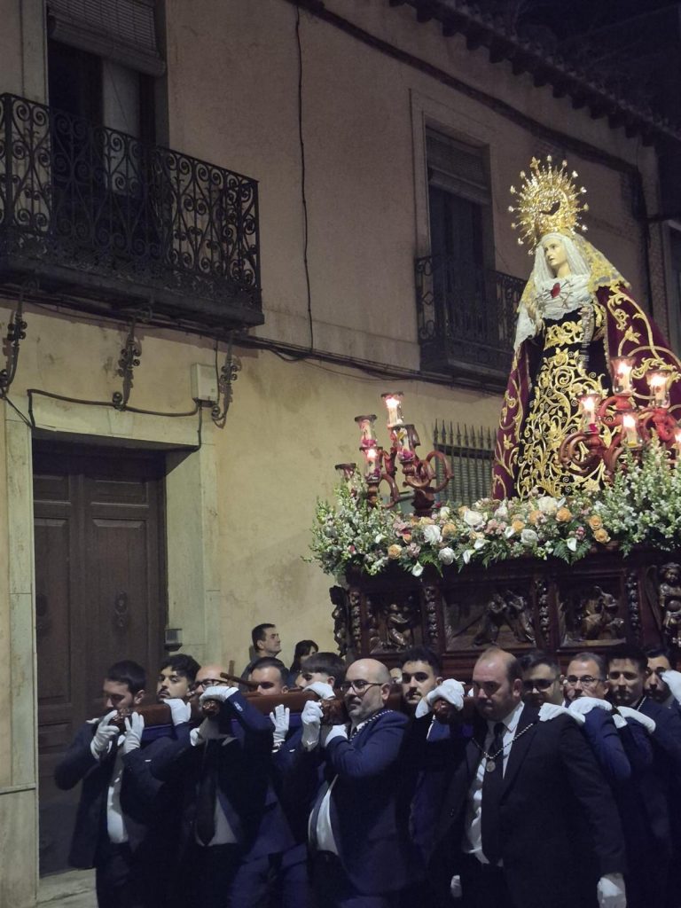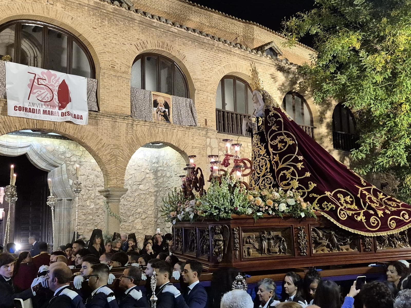 De manera excepcional, la Virgen fue portada en el trono de la Virgen del Primer Dolor, cedido para la ocasión por la Cofradía de Nuestro Padre Jesús Nazareno (‘Los Moraos’). La cuadrilla estuvo compuesta por 50 hermanos capuchinos que llevaron sobre sus hombros a la Imagen de María Desolada, acompañada en su camino por la multitud y los pétalos lanzados desde algunos balcones.