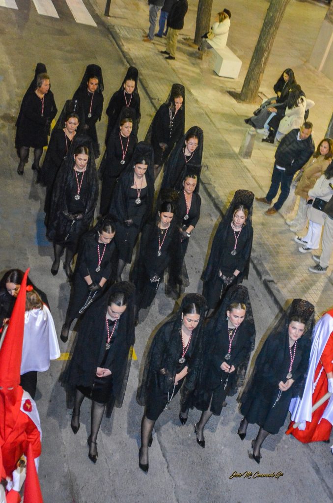 Luto, respeto y dolor quedaron reflejados por las mujeres vestidas con mantilla, bloques cada vez más nutridos, con incorporación de jóvenes, todas de mantilla negra y peineta, duelo por la muerte de Cristo. Elegancia y recogimiento en las madrinas de Daimiel, tradición española muestra de devoción hacia lo nuestro.